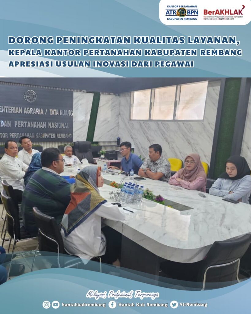 Rembang — Dalam upaya meningkatkan kualitas pelayanan kepada masyarakat, Kepala Kantor Pertanahan Kabupaten Rembang, Sun Eddy, menghadiri rapat presentasi Usulan Inovasi Layanan dan Penataan Sistem Layanan yang diselenggarakan pada Rabu (03/09/2025). Kegiatan ini juga diikuti oleh jajaran pejabat pengawas serta sejumlah pegawai yang menjadi inisiator usulan inovasi.