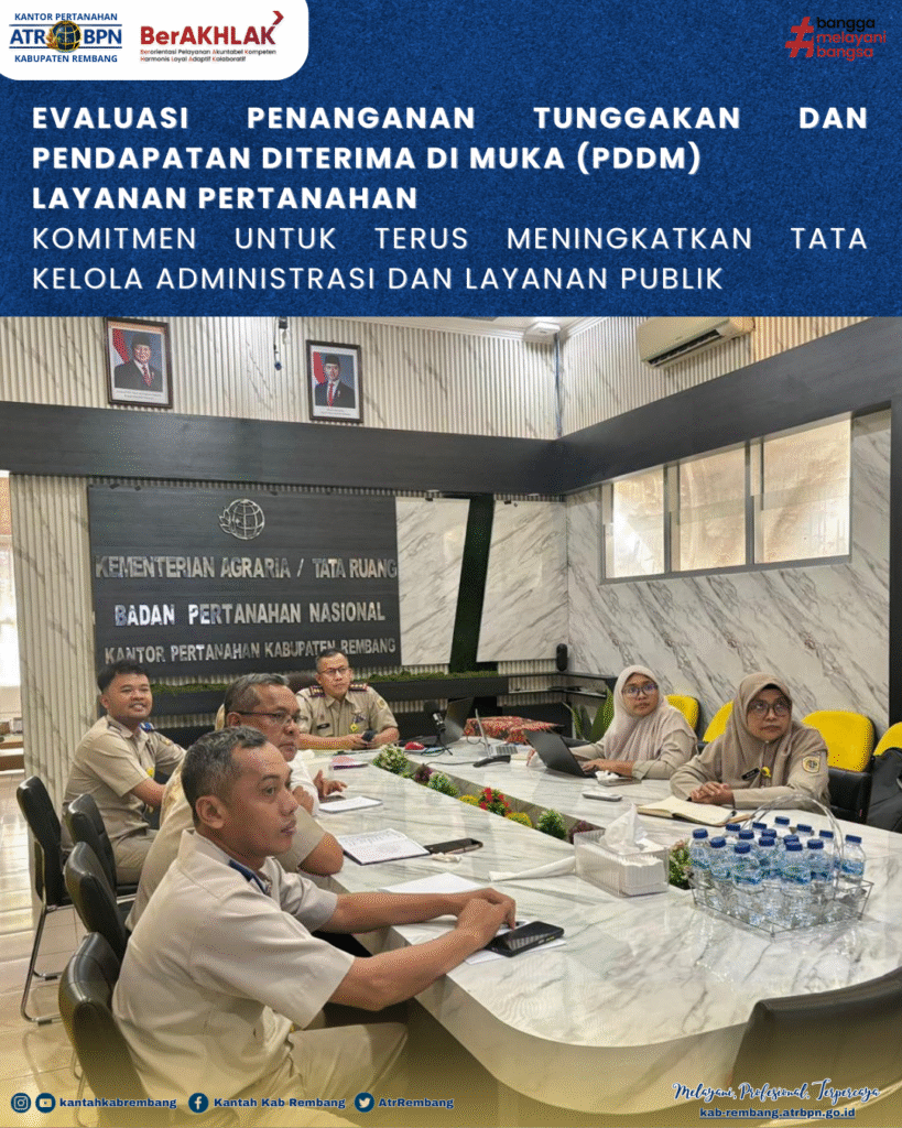 Rembang — Kepala Kantor Pertanahan Kabupaten Rembang, Mansur Fahmi, S.SiT., M.M. beserta pejabat pengawas Kantor Pertanahan Kabupaten Rembang mengikuti kegiatan Evaluasi Penanganan Tunggakan dan Pendapatan Diterima di Muka (PDDM) pada layanan pertanahan yang diselenggarakan secara daring oleh Sekretariat Jenderal Kementerian TAR/BPN sebagai upaya peningkatan kualitas pelayanan dan akuntabilitas pengelolaan keuangan negara pada sektor pertanahan pada Senin (24/11/2025).
