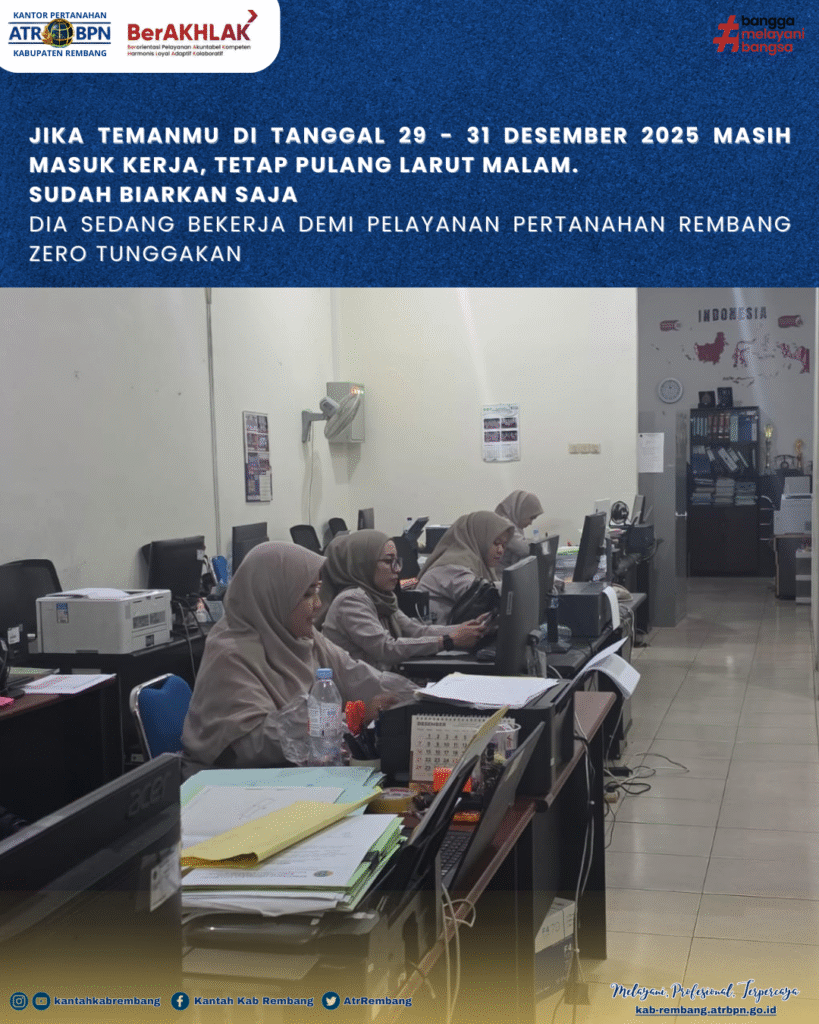 Jika Temanmu Di Tanggal 29 – 31 Desember 2025 Masih Masuk Kerja, Tetap Pulang Larut Malam. Sudah Biarkan Saja. Dia Sedang Bekerja Demi Pelayanan Pertanahan Rembang Zero Tunggakan