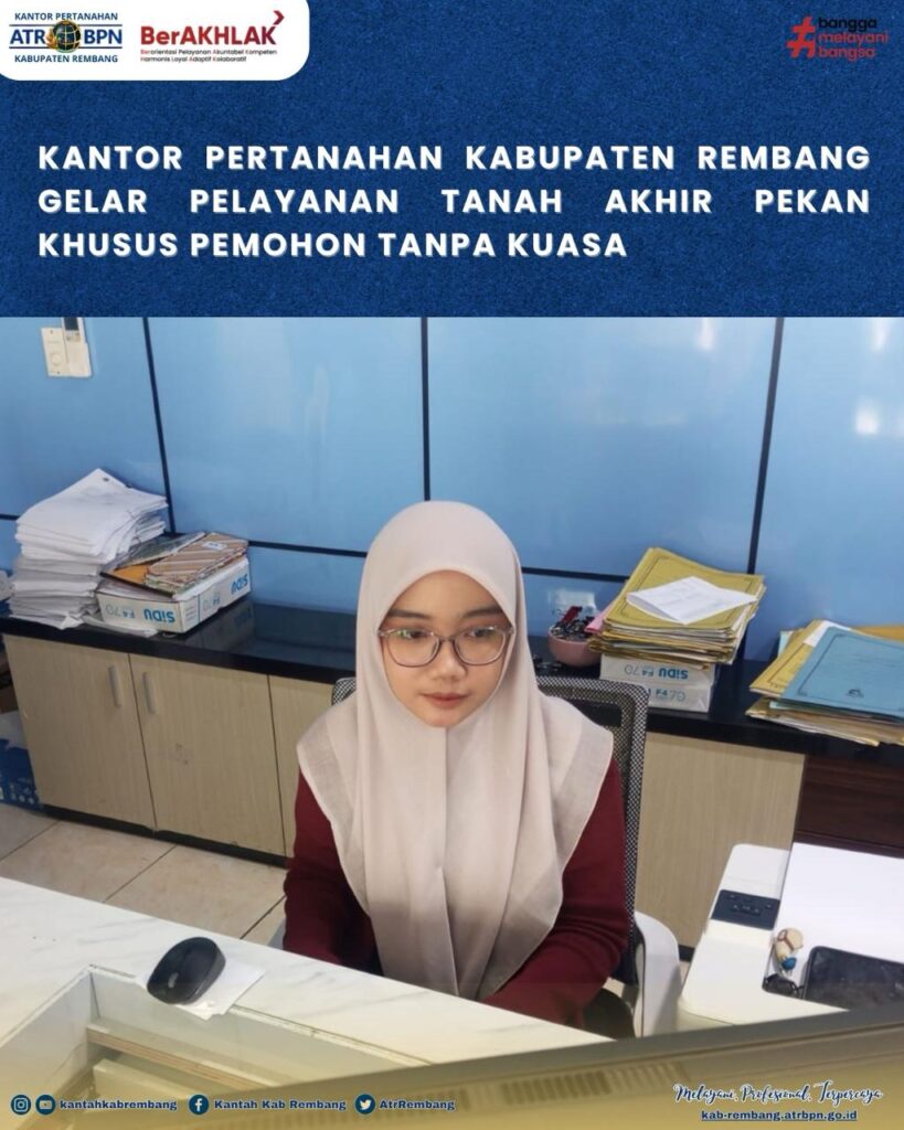 Rembang — Dalam rangka meningkatkan kualitas pelayanan kepada masyarakat, Kantor Pertanahan Kabupaten Rembang kembali menyelenggarakan Pelayanan Tanah Akhir Pekan pada hari Sabtu, 01 November 2025, yang diperuntukkan khusus bagi pemohon tanpa kuasa.