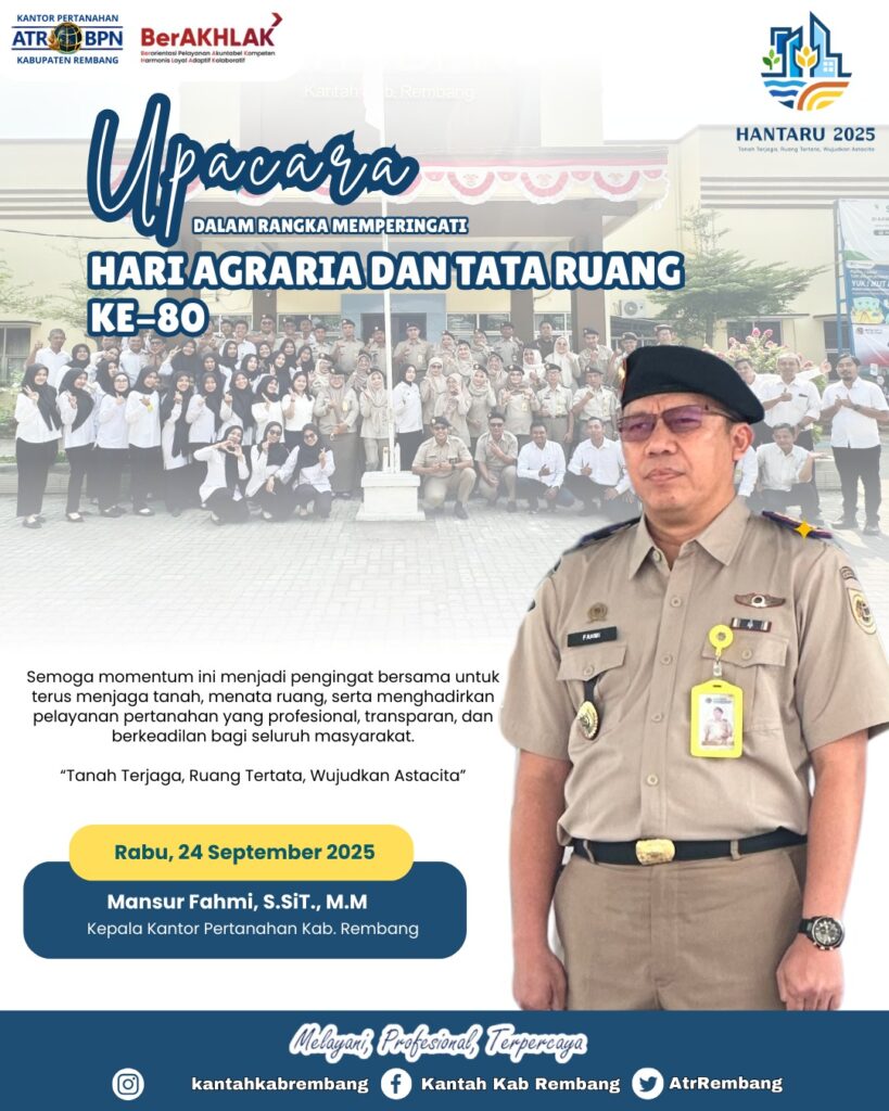 Rembang – Kantor Pertanahan Kabupaten Rembang menggelar Upacara Peringatan Hari Agraria dan Tata Ruang (HANTARU) Tahun 2025 sekaligus memperingati 65 tahun lahirnya Undang-Undang Pokok Agraria (UUPA) pada Rabu (24/09/2025).