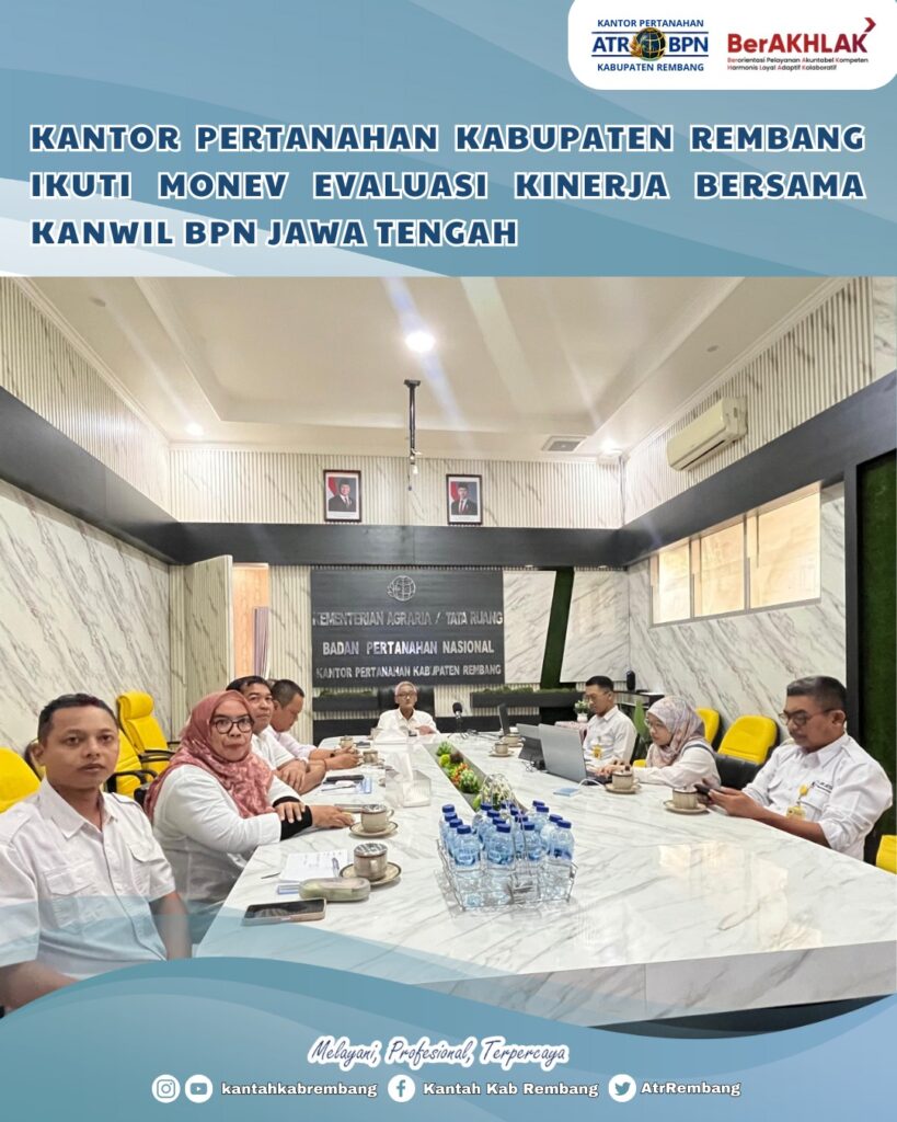 Rembang – Kantor Pertanahan Kabupaten Rembang mengikuti kegiatan Monitoring dan Evaluasi (Monev) Evaluasi Kinerja yang diselenggarakan oleh Kantor Wilayah Badan Pertanahan Nasional (BPN) Provinsi Jawa Tengah pada Rabu (20/08/2025). Kegiatan ini dilaksanakan secara daring dan diikuti oleh seluruh Kantor Pertanahan se-Jawa Tengah.