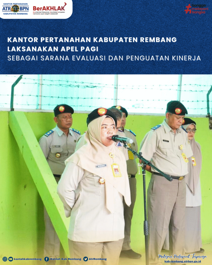 Rembang – Kantor Pertanahan Kabupaten Rembang melaksanakan kegiatan apel pagi yang dipimpin oleh Kepala Seksi Penataan dan Pemberdayaan, Ika Erawati, S.T., M.Sc. pada Selasa, (30/12/2025). Apel pagi diikuti oleh seluruh pegawai sebagai Kantor Pertanahan Kab. Rembang sebagai upaya penguatan disiplin, koordinasi, dan penyampaian informasi strategis terkait pelaksanaan tugas dan fungsi pelayanan pertanahan.