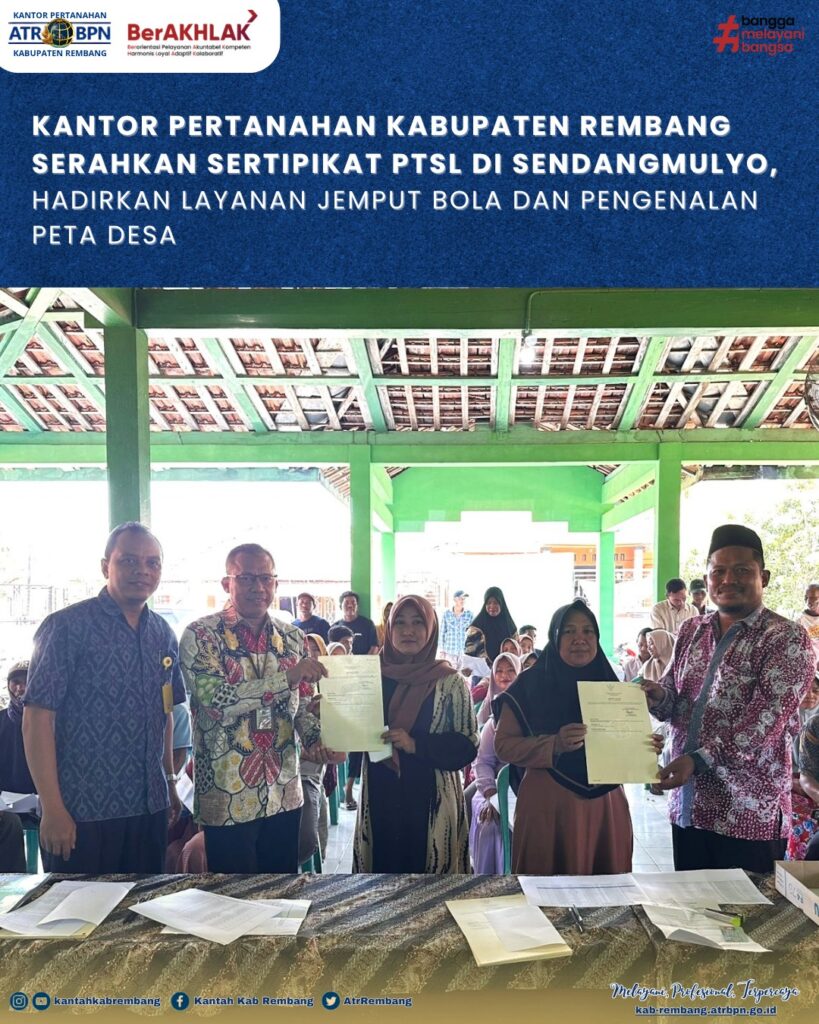 Kantor Pertanahan Kabupaten Rembang Serahkan Sertipikat PTSL di Sendangmulyo, Hadirkan Layanan Jemput Bola dan Pengenalan Peta Desa