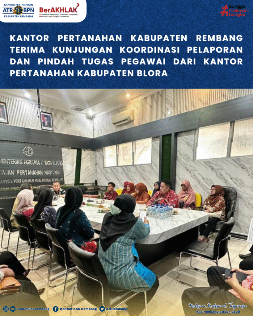 Rembang — Kantor Pertanahan Kabupaten Rembang menerima kunjungan koordinasi dari Kantor Pertanahan Kabupaten Blora dalam rangka pelaporan dan proses pindah tugas pegawai, Kamis (28/11/2025). Pertemuan berlangsung di ruang rapat Kantah Rembang dan dihadiri oleh Kepala Kantor Pertanahan Kab. Rembang, Mansur Fahmi, S.SiT., M.M., jajaran pejabat struktural serta perwakilan pegawai dari kedua satuan kerja.