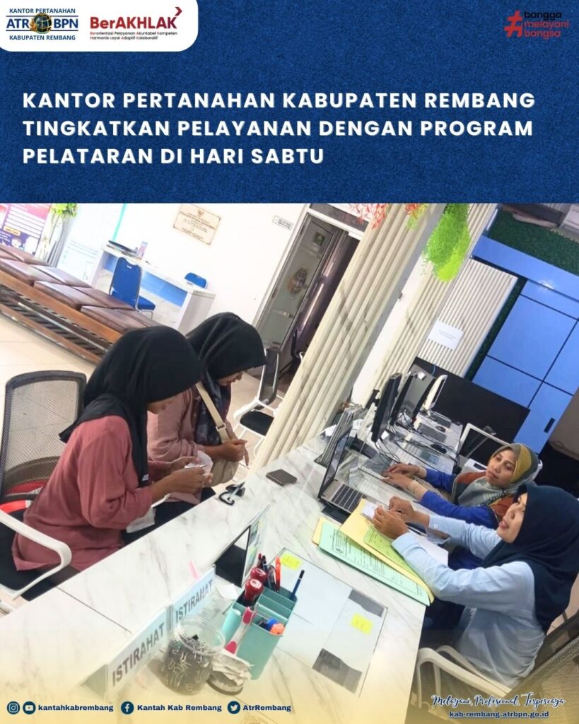 Rembang, – Kantor Pertanahan Kabupaten Rembang kembali menghadirkan layanan inovatif bagi masyarakat dengan membuka pelayanan PELATARAN (Pelayanan Tanah Akhir Pekan) pada Sabtu (20/09/2025). Program ini diperuntukkan khusus bagi masyarakat yang mengurus sertipikat tanah secara mandiri tanpa melalui kuasa atau perantara.
