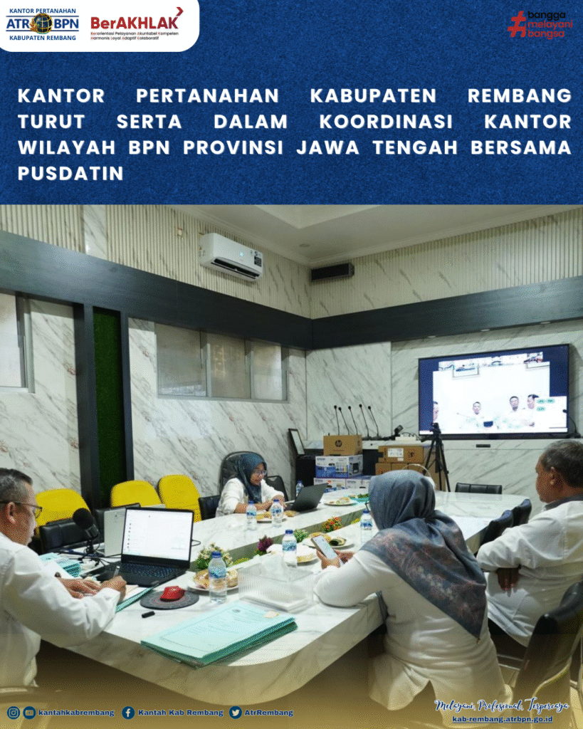 Rembang – Kantor Pertanahan Kabupaten Rembang turut serta dalam kegiatan koordinasi yang diselenggarakan oleh Kantor Wilayah Badan Pertanahan Nasional (BPN) Provinsi Jawa Tengah bersama Pusat Data dan Informasi (PUSDATIN) secara daring pada Rabu (31/12/2025). Kegiatan ini diikuti oleh Kepala Kantor Pertanahan Kabupaten Rembang beserta para pejabat pengawas sebagai bentuk komitmen dalam mendukung penguatan pengelolaan data dan informasi pertanahan.