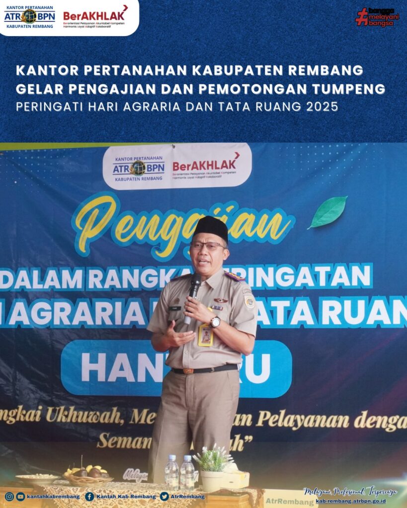 Rembang – Dalam rangka memperingati Hari Agraria dan Tata Ruang (HANTARU) Tahun 2025 sekaligus 65 tahun Undang-Undang Pokok Agraria (UUPA), Kantor Pertanahan Kabupaten Rembang menyelenggarakan pengajian dan pemotongan tumpeng pada Rabu (24/09/2025).