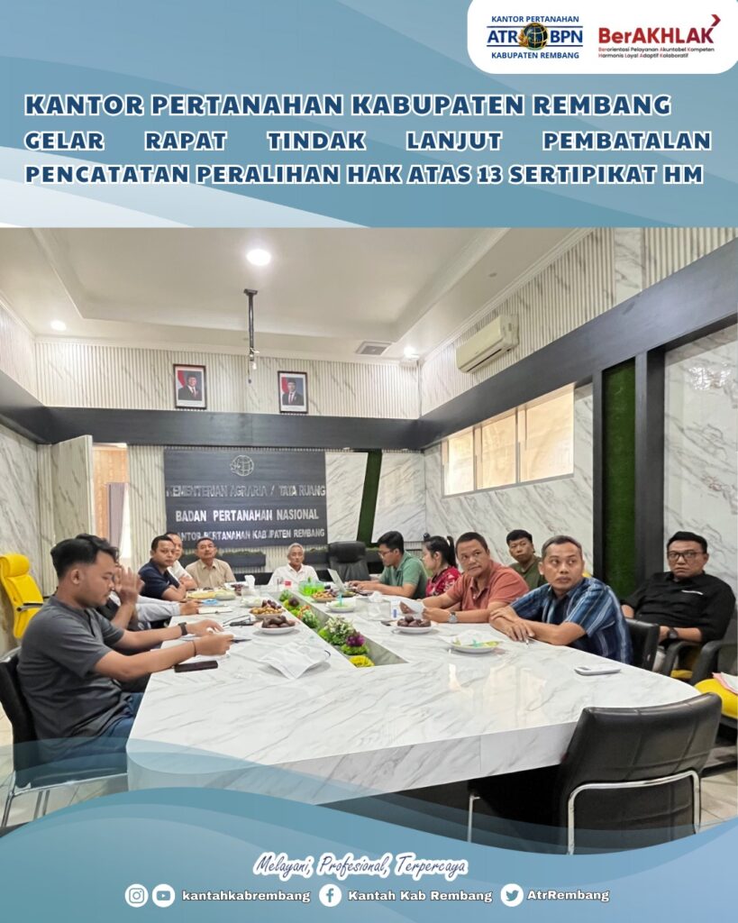 Kepala Kantor Pertanahan Kabupaten Rembang Gelar Rapat Tindak Lanjut Pembatalan Pencatatan Peralihan Hak atas 13 Sertipikat HM