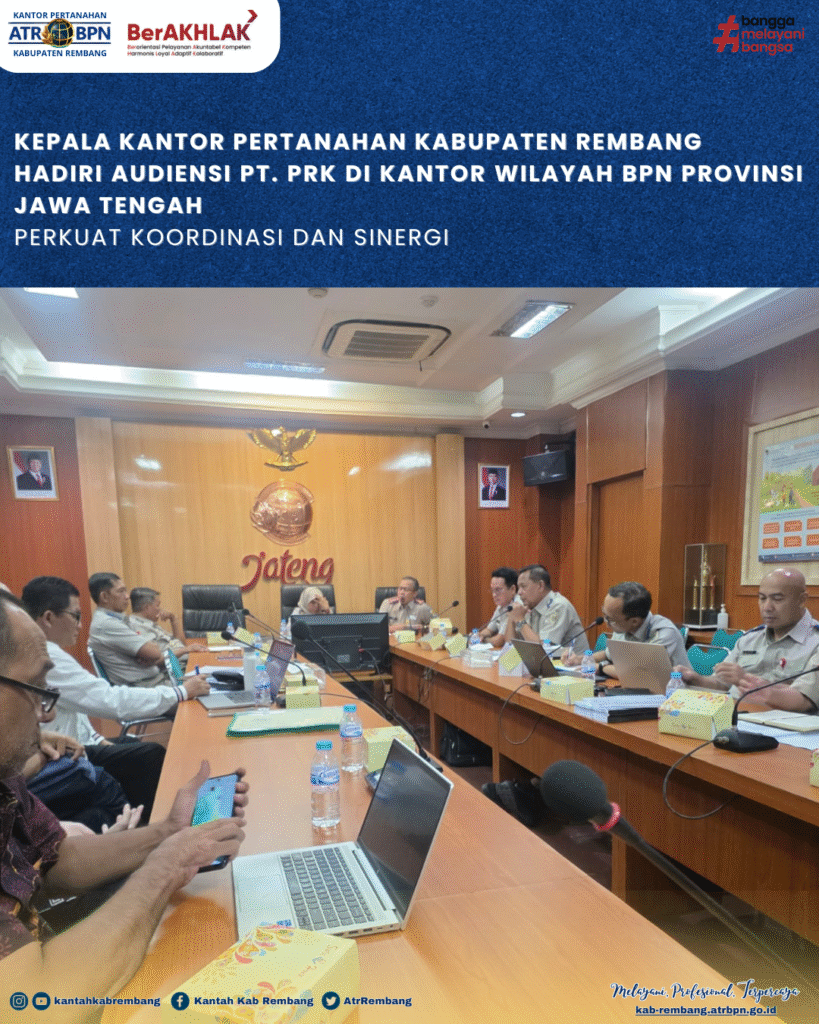 Semarang – Kepala Kantor Pertanahan Kabupaten Rembang, Mansur Fahmi, S.SiT., M.M. berseta Pejabat Pengawas menghadiri kegiatan audiensi bersama PT. PRK yang dilaksanakan di Kantor Wilayah BPN Provinsi Jawa Tengah pada Selasa (10/02/2026). Kegiatan ini menjadi momentum penting dalam memperkuat koordinasi dan sinergi antara instansi pertanahan dengan pihak perusahaan dalam rangka mendukung tertib administrasi dan kepastian hukum di bidang pertanahan.