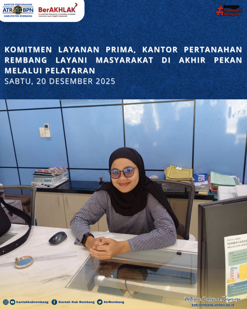 Rembang – Sabtu (20/12/2025) Sebagai Wujud Komitmen Dalam Memberikan Layanan Prima Kepada Masyarakat, Kantor Pertanahan Kabupaten Rembang Terus Menghadirkan Inovasi Pelayanan Melalui Program Pelayanan Pertanahan Akhir Pekan (PELATARAN). Program Ini Menjadi Solusi Bagi Masyarakat Yang Memiliki Keterbatasan Waktu Untuk Mengurus Layanan Pertanahan Pada Hari Kerja.