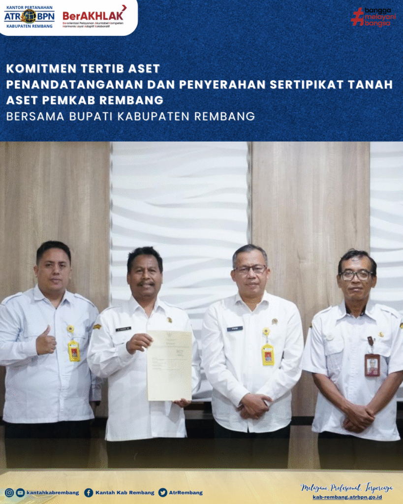 Rembang, – Kantor Pertanahan Kabupaten Rembang kembali menegaskan komitmennya dalam mewujudkan tertib administrasi dan kepastian hukum atas aset daerah melalui penandatanganan dan penyerahan sertipikat tanah aset Pemerintah Kabupaten Rembang. Kegiatan tersebut dilaksanakan pada Rabu (04/03/2026) di Kantor Bupati Kabupaten Rembang.