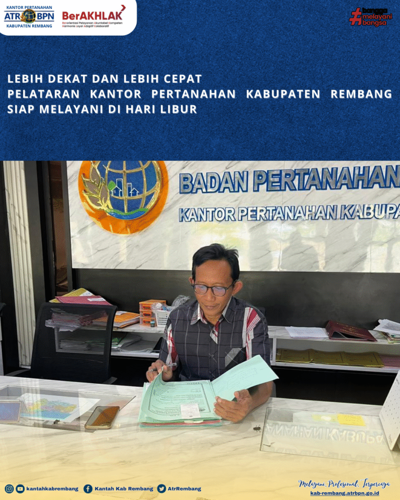 Rembang – Dalam rangka memberikan kemudahan akses layanan kepada masyarakat, Kantor Pertanahan Kabupaten Rembang kembali menghadirkan Pelayanan Pertanahan Akhir Pekan (PELATARAN) sebagai wujud komitmen pelayanan prima. Program ini menjadi solusi bagi masyarakat yang memiliki keterbatasan waktu pada hari kerja, sehingga tetap dapat mengurus berbagai keperluan pertanahan di hari libur.