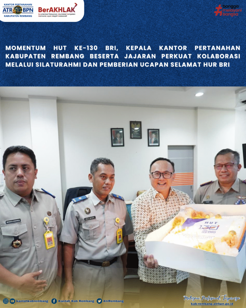 Momentum HUT Ke-130 BRI, Kepala Kantor Pertanahan Kabupaten Rembang Beserta Jajaran Perkuat Kolaborasi Melalui Silaturahmi Dan Pemberian Ucapan Selamat HUT BRI