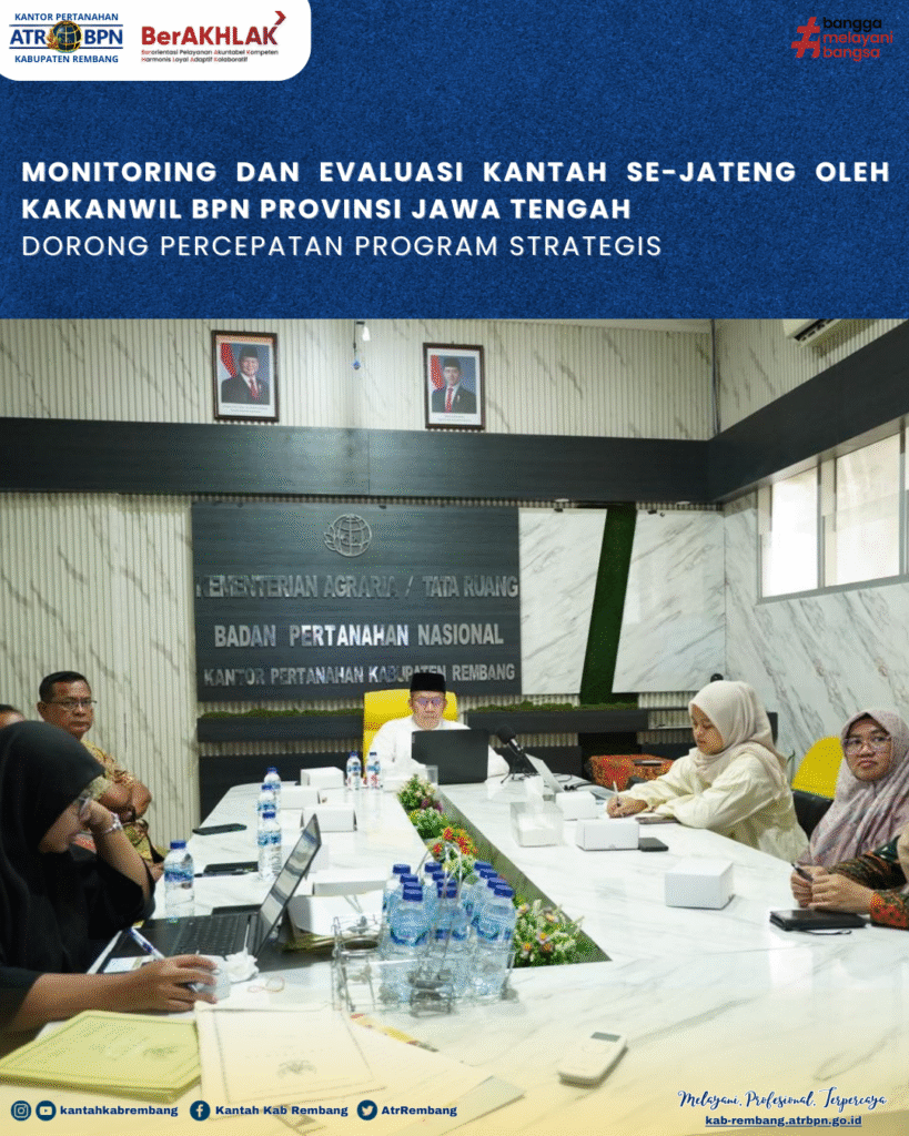 Rembang – Kepala Kantor Pertanahan Kabupaten Rembang, Mansur Fahmi, S.SiT., M.M. beserta Pejabat Pengawan dan KKS, mengikuti kegiatan Monitoring dan Evaluasi Kinerja Kantor Pertanahan se-Jawa Tengah secara daring yang dipimpin langsung oleh Kepala Kantor Wilayah Badan Pertanahan Nasional Provinsi Jawa Tengah, Jumat (13/02/2026).