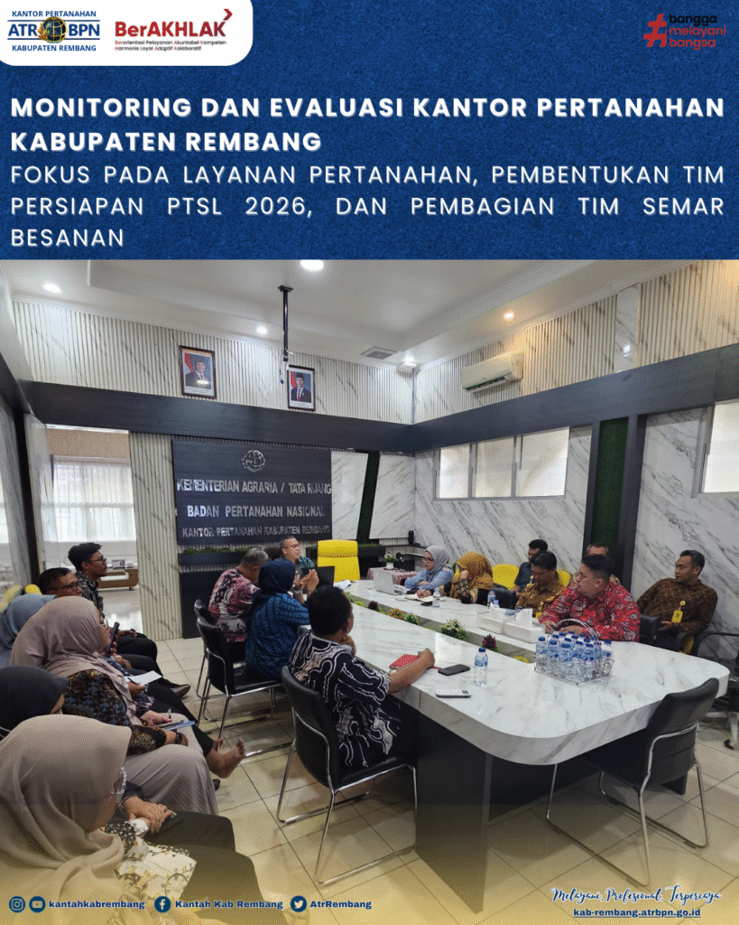 MONITORING DAN EVALUASI KANTOR PERTANAHAN KABUPATEN REMBANG FOKUS PADA PELAYANAN PERTANAHAN, PEMBENTUKAN TIM PERSIAPAN PTSL 2026 DAN PEMBAGIAN TIM SEMAR BESANAN