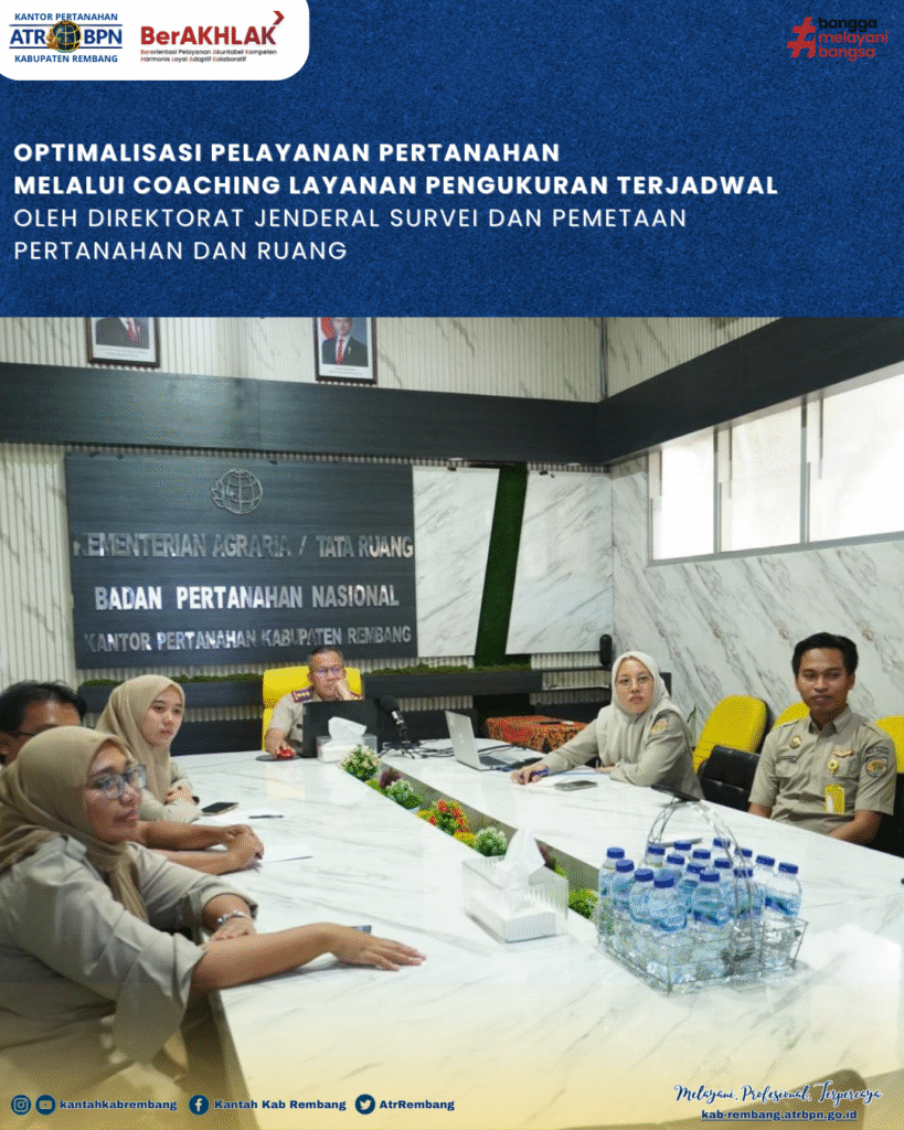 Rembang, – Dalam rangka meningkatkan kualitas dan kepastian layanan kepada masyarakat, Kantor Pertanahan Kabupaten Rembang mengikuti kegiatan Coaching Layanan Pengukuran Terjadwal yang diselenggarakan oleh Direktorat Jenderal Survei dan Pemetaan Pertanahan dan Ruang pada Senin (02/03/2026). Kegiatan ini dilaksanakan secara daring dan diikuti oleh Kepala Kantor Pertanahan Kabupaten Rembang beserta Pejabat Pengawas, Koordinator Kelompok Substansi (KKS), serta staf Pengukuran.