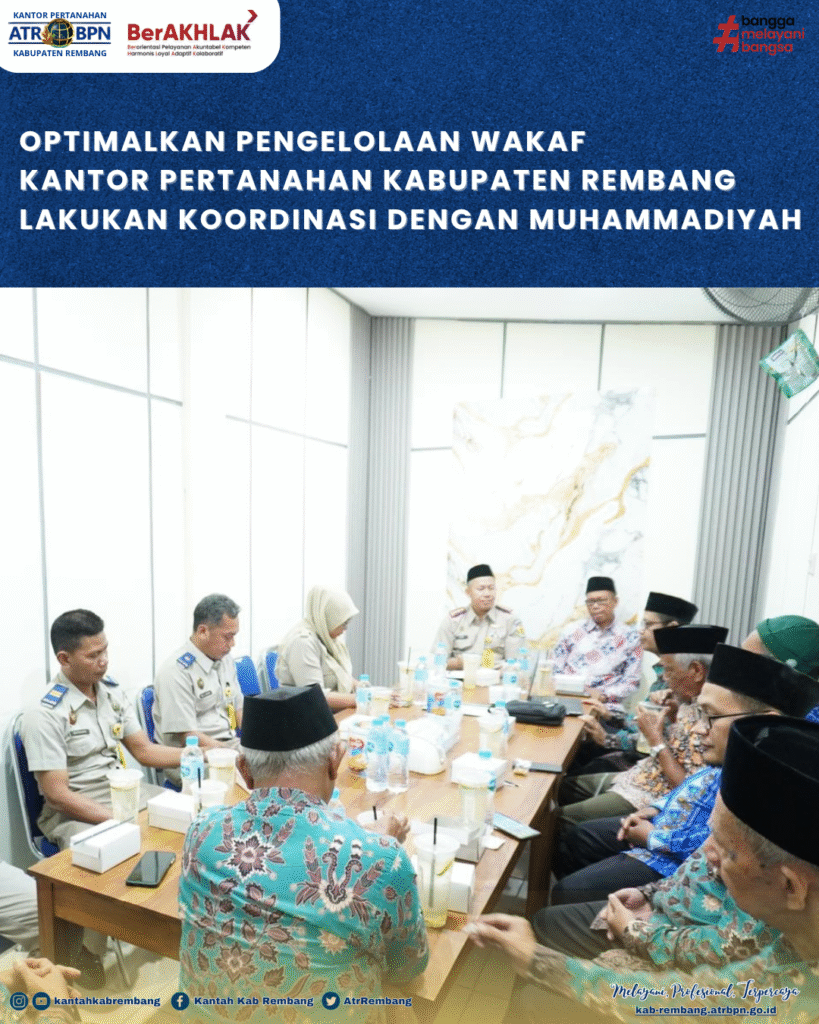 Rembang,— Dalam rangka mengoptimalkan pengelolaan dan pemanfaatan tanah wakaf, Kantor Pertanahan Kabupaten Rembang melaksanakan koordinasi bersama Muhammadiyah Kabupaten Rembang yang bertempat di Kantor Muhammadiyah Rembang pada Selasa (31/03/2026).