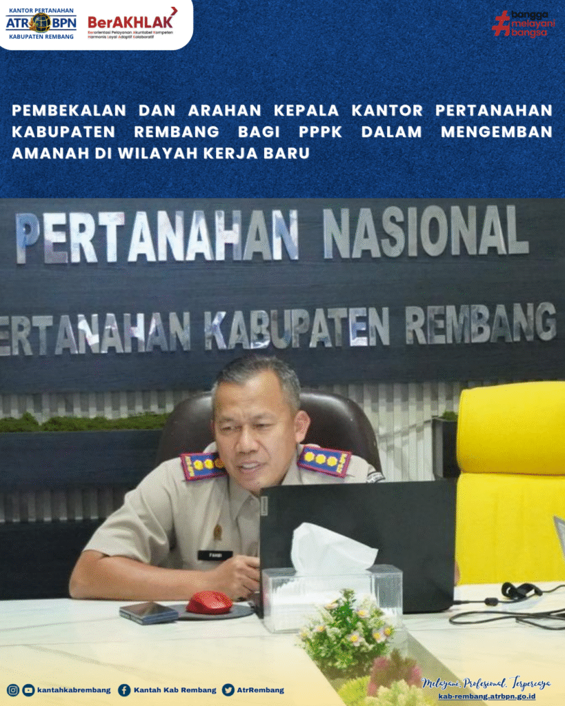 Dengan adanya pembekalan dan arahan ini, diharapkan PPPK Kantor Pertanahan Kabupaten Rembang siap melaksanakan amanah di tempat tugas yang baru secara profesional, akuntabel, dan tetap menjunjung tinggi nilai-nilai pelayanan prima kepada masyarakat.