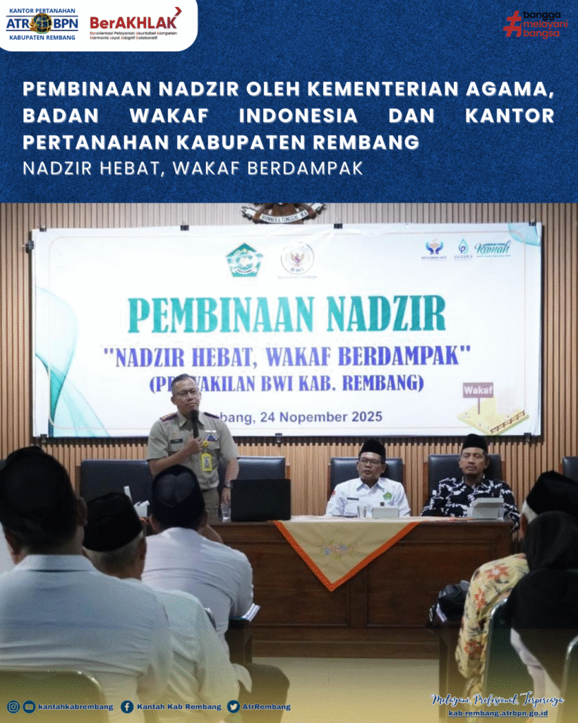 Rembang — Dalam rangka meningkatkan kapasitas dan profesionalitas para nadzir dalam mengelola aset wakaf, Kementerian Agama Kabupaten Rembang bersama Badan Wakaf Indonesia (BWI) Kabupaten Rembang dan Kantor Pertanahan Kabupaten Rembang menggelar kegiatan Pembinaan Nadzir Wakaf, yang diselenggarakan pada Senin (24/11/2025) di Ruang Aula Kantor Kementerian Agama Kabupaten Rembang.