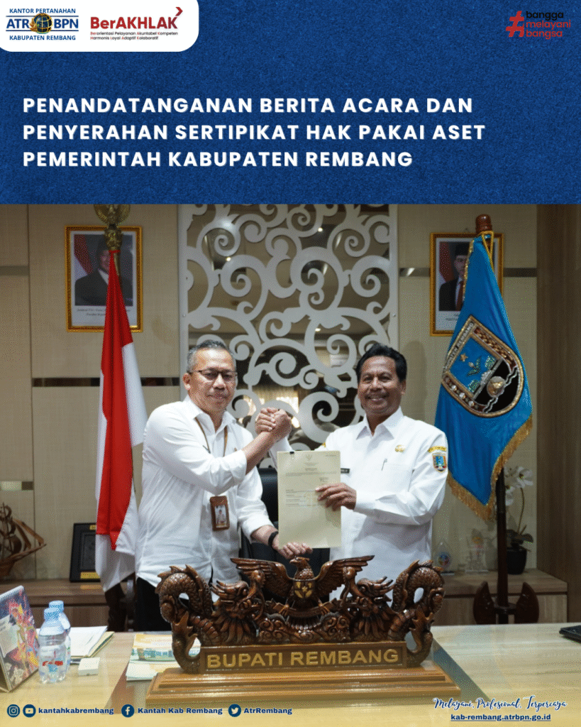 Kepala Kantor Pertanahan Kabupaten Rembang, Mansur Fahmi, S.SiT., M.M. menyerahkah Sertipikat Hak Pakai Aset Pemerintah Kabupaten Rembang kepada Bupati Rembang. Kegiatan penyerahan sertipikat diserahkan langsung di Kantor Bupati Kabupaten Rembang pada (05/11/2025). Ini merupakan langkah penting dalam pengelolaan asset pemerintah yang lebih baik.