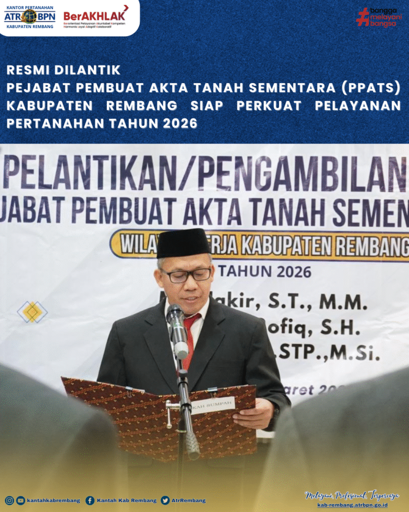 Rembang – Kepala Kantor Pertanahan Kabupaten Rembang, , Mansur Fahmi, S.SiT., M.M. melaksanakan pelantikan dan pengambilan sumpah Pejabat Pembuat Akta Tanah Sementara (PPATS) pada Rabu, 11 Maret 2026, bertempat di ruang rapat Kantor Pertanahan Kabupaten Rembang. Kegiatan ini dilaksanakan sebagai upaya memperkuat pelayanan pertanahan kepada masyarakat di wilayah Kabupaten Rembang.