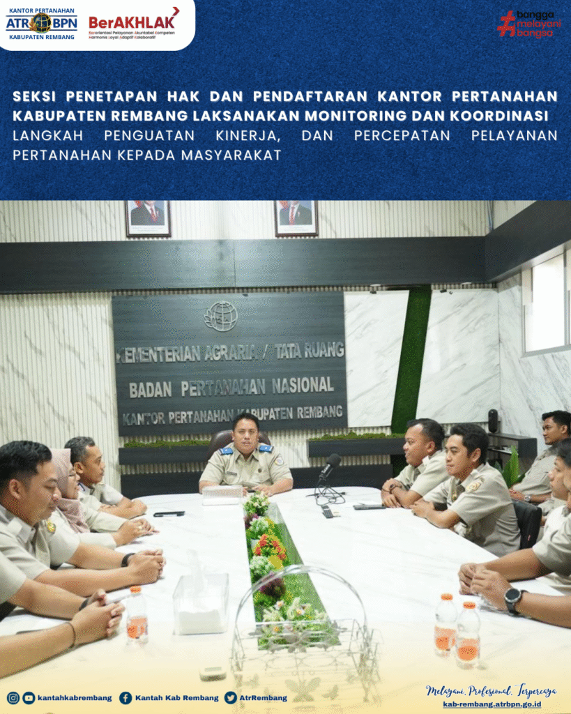 Rembang — Seksi Penetapan Hak dan Pendaftaran Kantor Pertanahan Kabupaten Rembang melaksanakan kegiatan monitoring dan koordinasi sebagai langkah penguatan kinerja, dan percepatan pelayanan pertanahan kepada masyarakat. Kegiatan tersebut berlangsung pada Selasa (09/12/2025) di ruang rapat Kantor Pertanahan Kabupaten Rembang dan dipimpin langsung oleh Kepala Seksi Penetapan Hak dan Pendaftaran, Monza Andrea, S.S.T. dan dihadiri seluruh staff terkait.