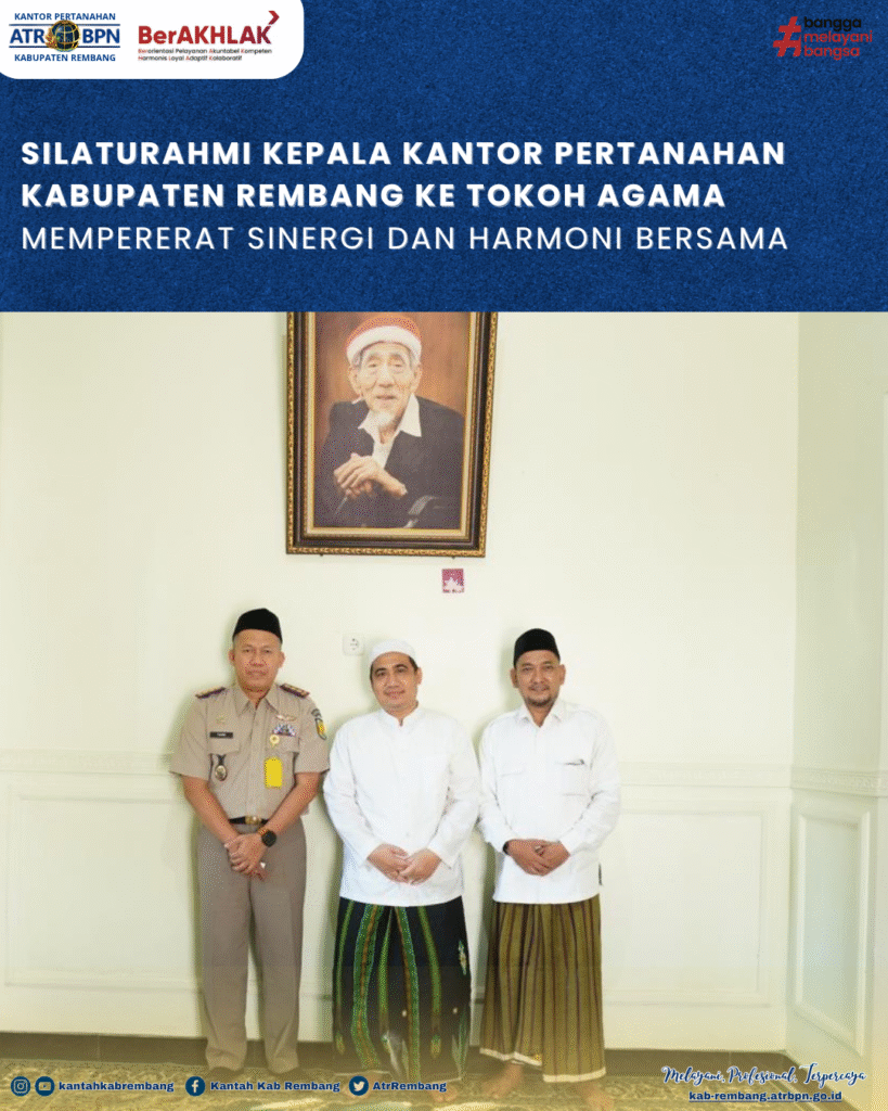 Rembang,— Kepala Kantor Pertanahan Kabupaten Rembang melaksanakan kegiatan silaturahmi kepada tokoh agama di wilayah Kecamatan Sarang, Kabupaten Rembang. Kunjungan ini dilakukan ke Pondok Pesantren Sarang dengan bertemu langsung dengan Dr. KH. Abdul Ghofur Maimun serta KH. Rosyid Ubab Maimoen Zubair (Gus Rosyid Ubab) pada Senin (30/03/2026).