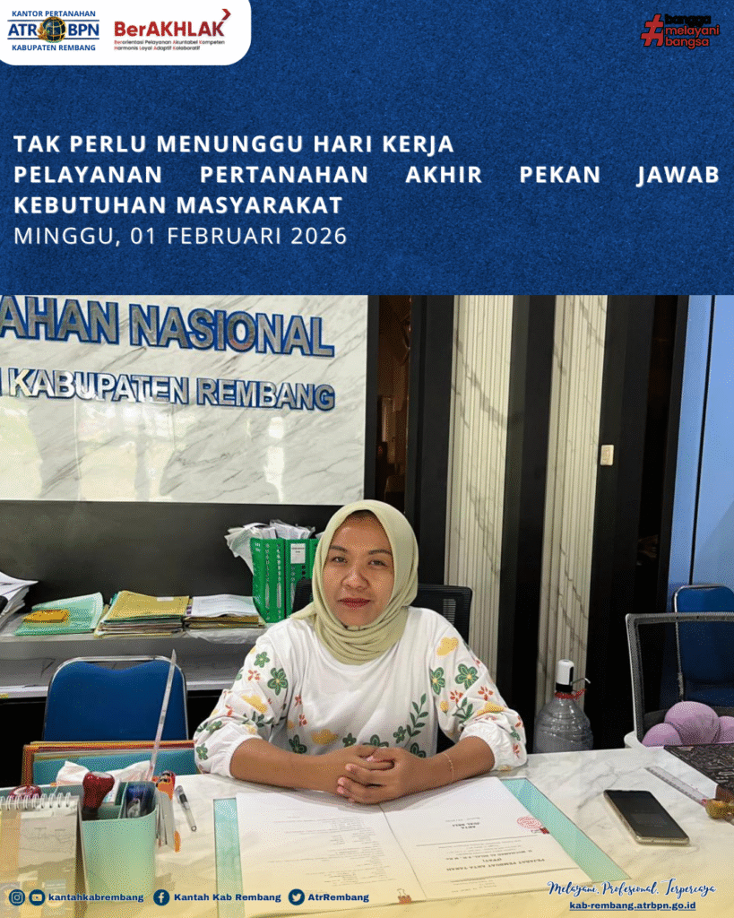 Rembang – Kantor Pertanahan Kabupaten Rembang kembali menunjukkan komitmennya dalam memberikan pelayanan prima kepada masyarakat melalui Pelayanan Pertanahan Akhir Pekan (PELATARAN) yang dilaksanakan pada Minggu, 01 Februari 2026. Layanan ini menjadi solusi nyata bagi masyarakat yang memiliki keterbatasan waktu pada hari kerja.