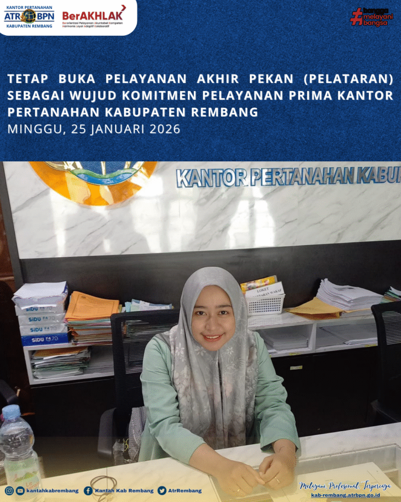 Rembang – Sebagai bentuk komitmen dalam memberikan pelayanan pertanahan yang optimal kepada masyarakat, Kantor Pertanahan Kabupaten Rembang kembali menyelenggarakan Pelayanan Akhir Pekan (PELATARAN) pada Minggu, 25 Januari 2026. Kegiatan ini merupakan upaya berkelanjutan untuk meningkatkan aksesibilitas layanan publik, khususnya bagi masyarakat yang tidak dapat memanfaatkan pelayanan pada hari kerja.