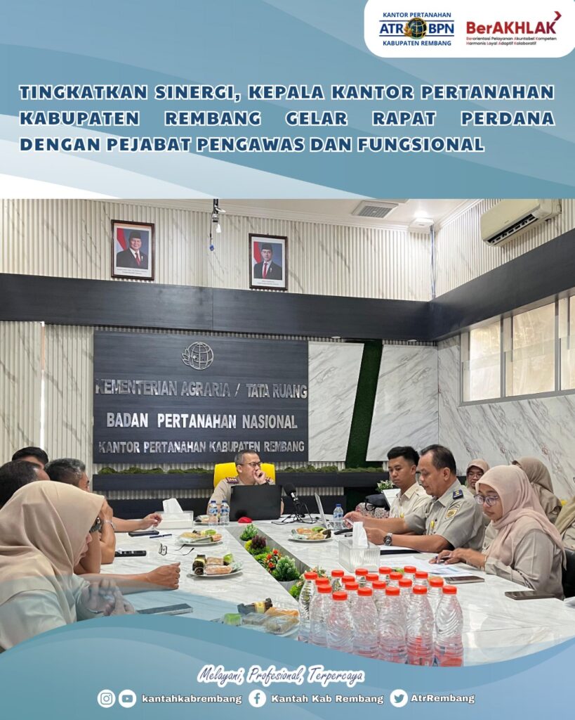 Rembang — Kepala Kantor Pertanahan Kabupaten Rembang, Mansur Fahmi, menggelar rapat perdana bersama seluruh Pejabat Pengawas dan Pejabat Fungsional di ruang rapat pada Selasa (16/09/2025). Pertemuan ini merupakan langkah awal dalam membangun sinergi dan menyamakan persepsi dalam pelaksanaan tugas di lingkungan Kantah Rembang.