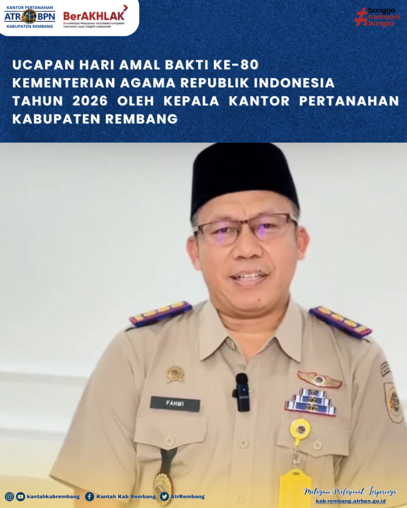 Rembang – Dalam rangka memperingati Hari Amal Bakti ke-80 Kementerian Agama Republik Indonesia Tahun 2026, pada Sabtu (03/01/2026) Kepala Kantor Pertanahan Kabupaten Rembang, Mansur Fahmi, S.SiT., M.M. turut memberikan ucapan selamat.