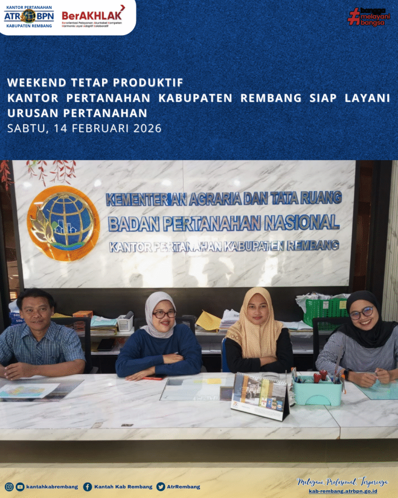 Rembang, Sabtu (14/02/2026) – Komitmen memberikan pelayanan terbaik kepada masyarakat terus diwujudkan oleh Kantor Pertanahan Kabupaten Rembang melalui layanan pertanahan di akhir pekan. Meski memasuki hari libur, jajaran tetap hadir dan sigap melayani berbagai kebutuhan administrasi pertanahan masyarakat.